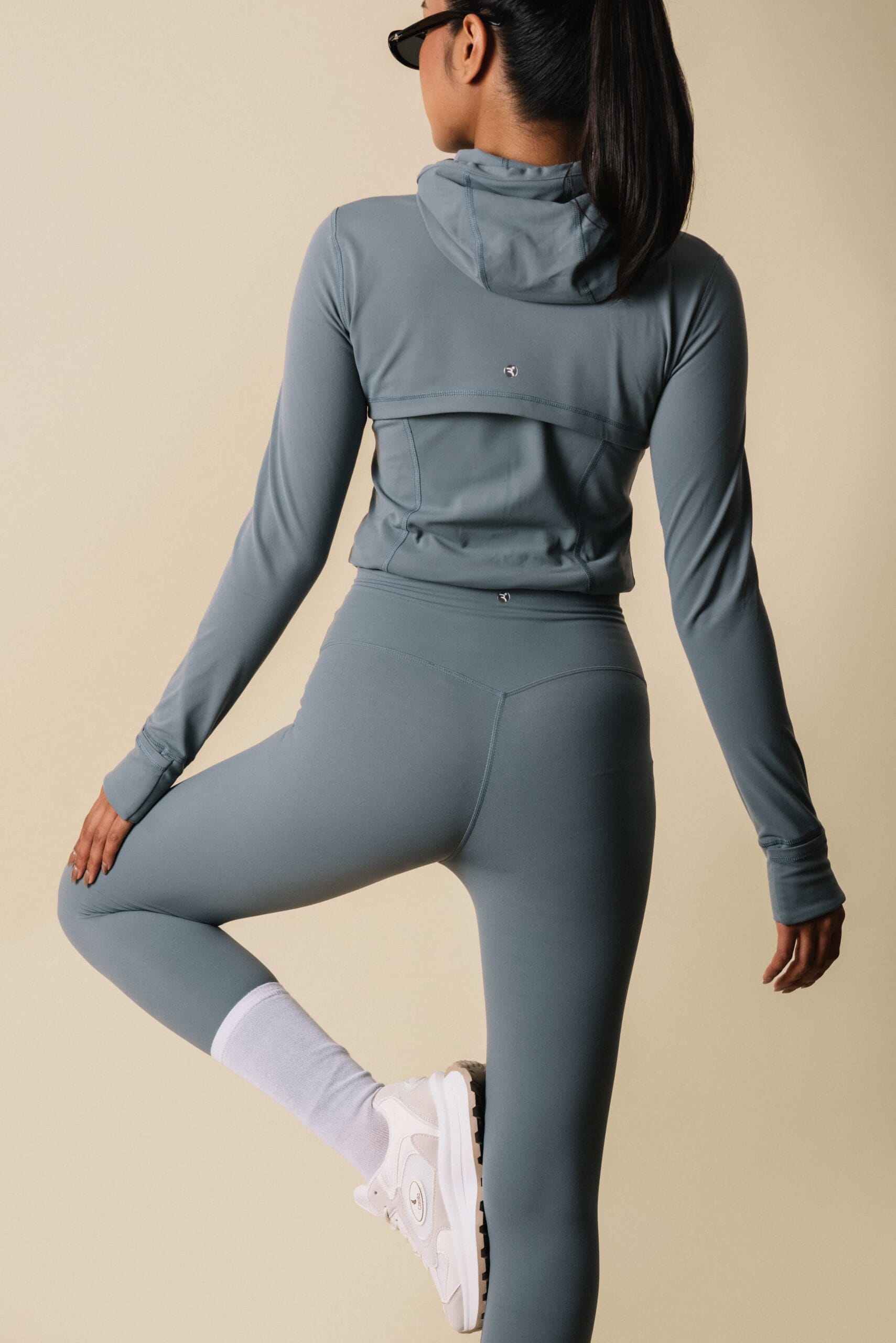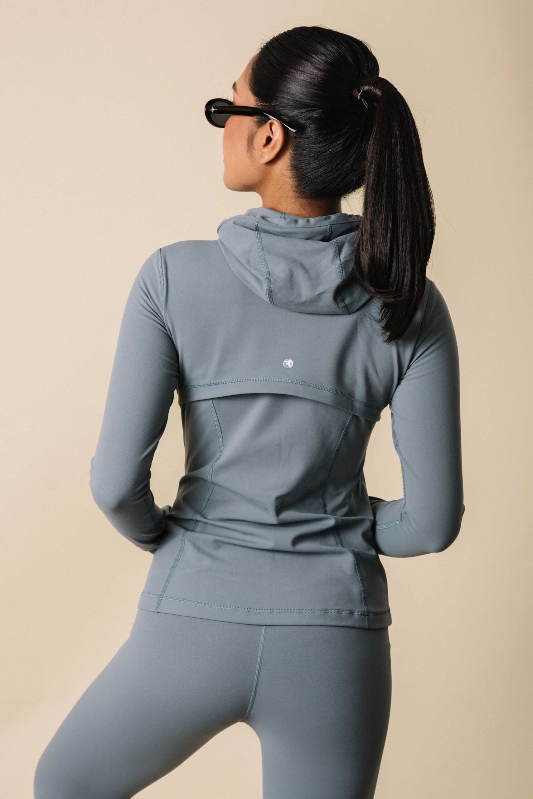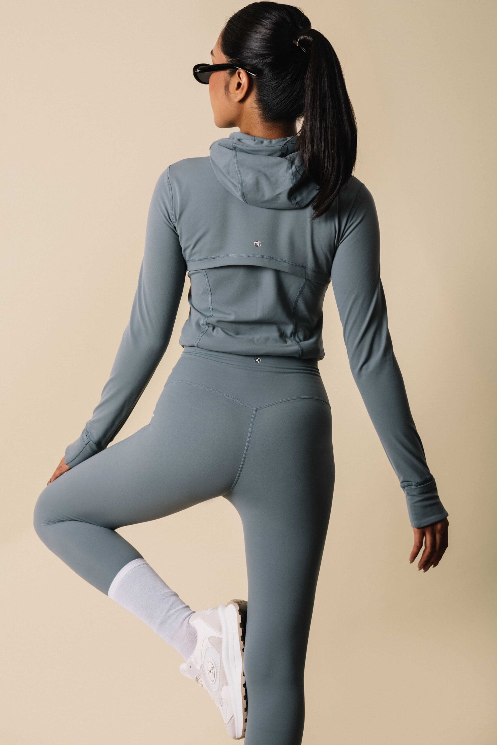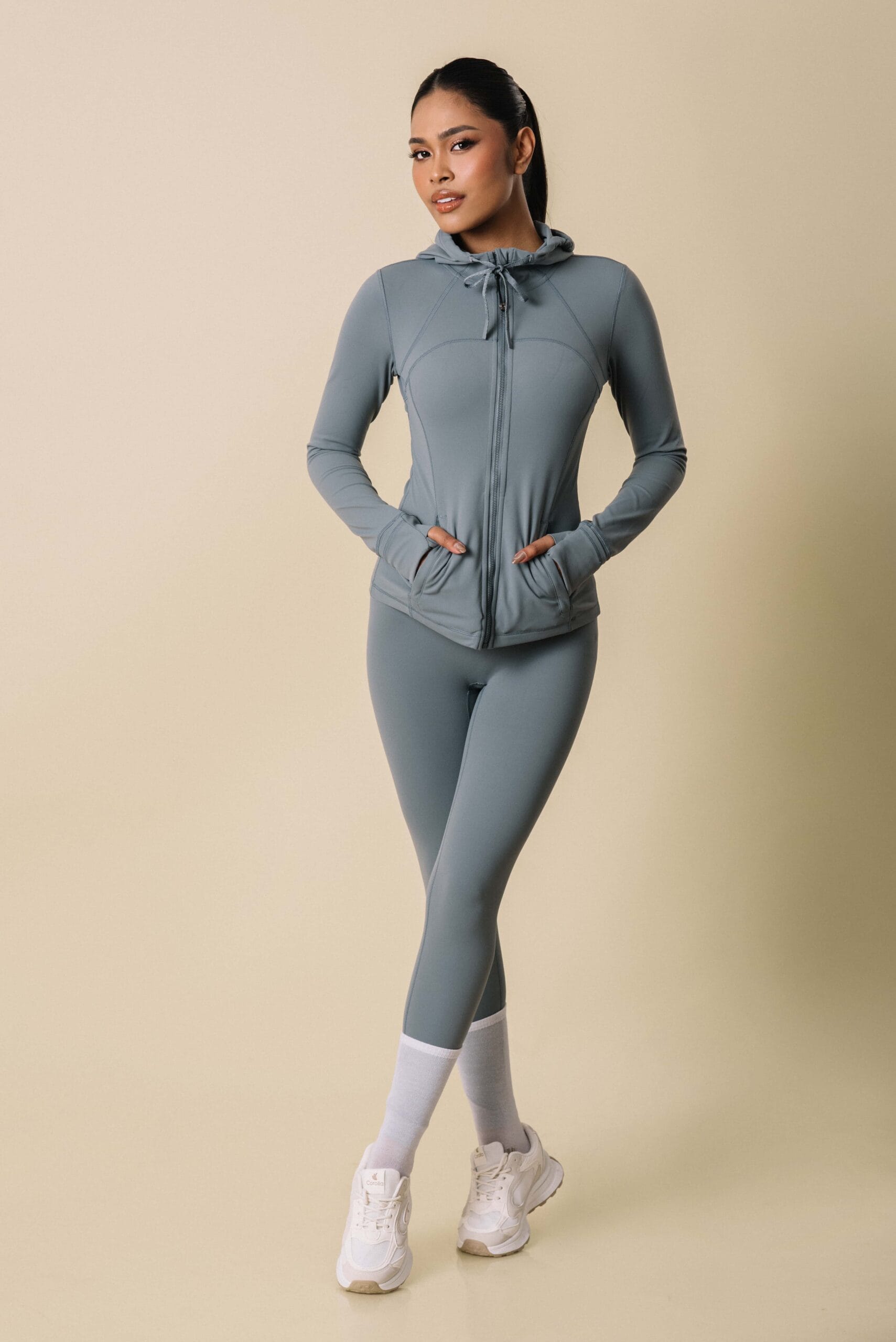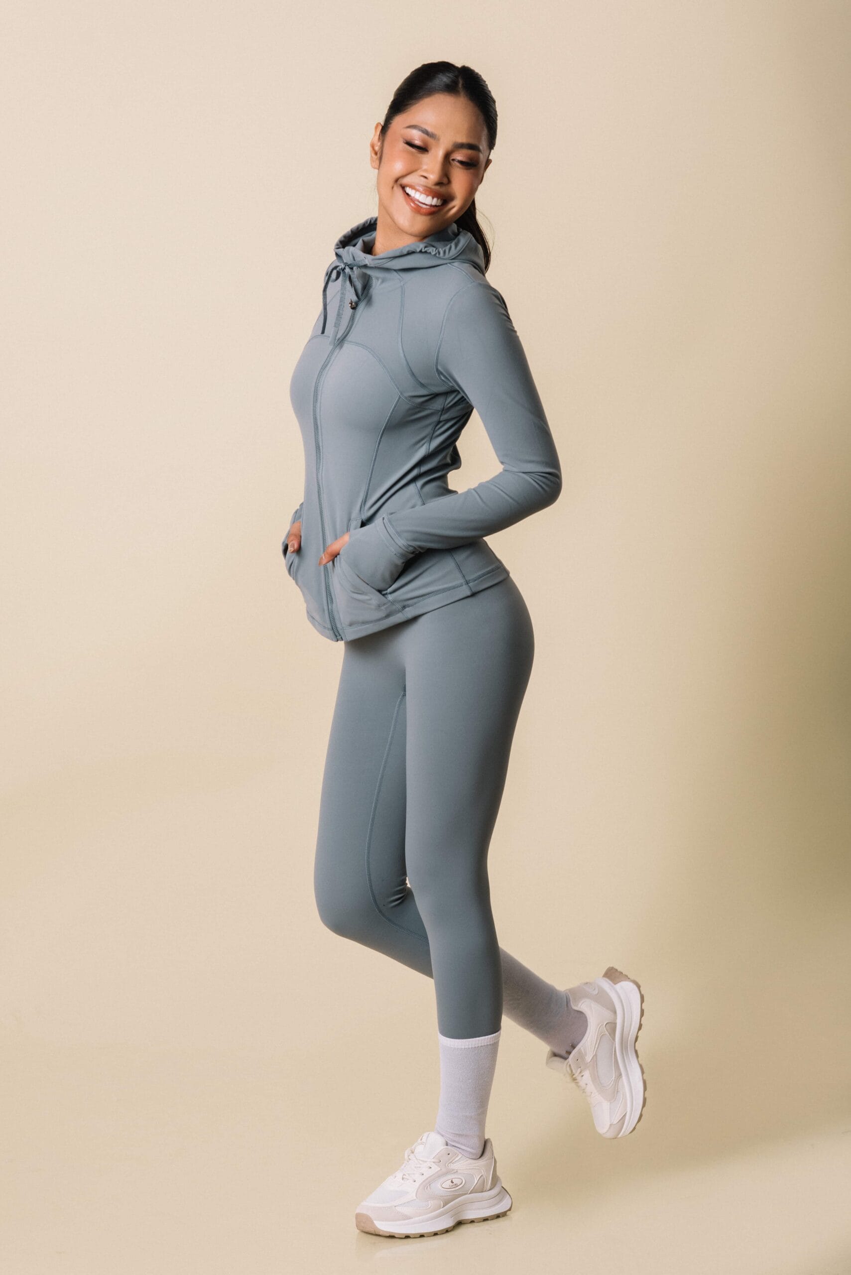 Sleek zip-up jacket features sculpting seam paired with high-rise leggings.